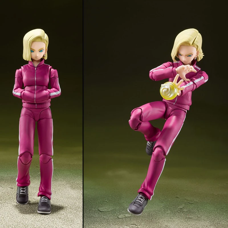 Dragon Ball Super Figurine Android 18 dans la gamme S.H.Figuarts de Bandai tamashii Nation. Figurine articulée en PVC, taille: 15 cm du cyborg 18 version DBS.