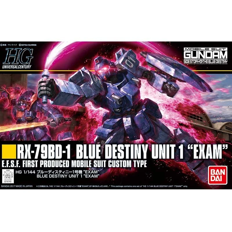 Gundam Universal Century Gundam Blue Destiny Unit 1 “Exam” dans la gamme HG par Bandai.Gunpla maquette du robot Blue Destiny Unit 1 “Exam” High Grade 1/144 avec de nombreux accessoires pour varier les poses.